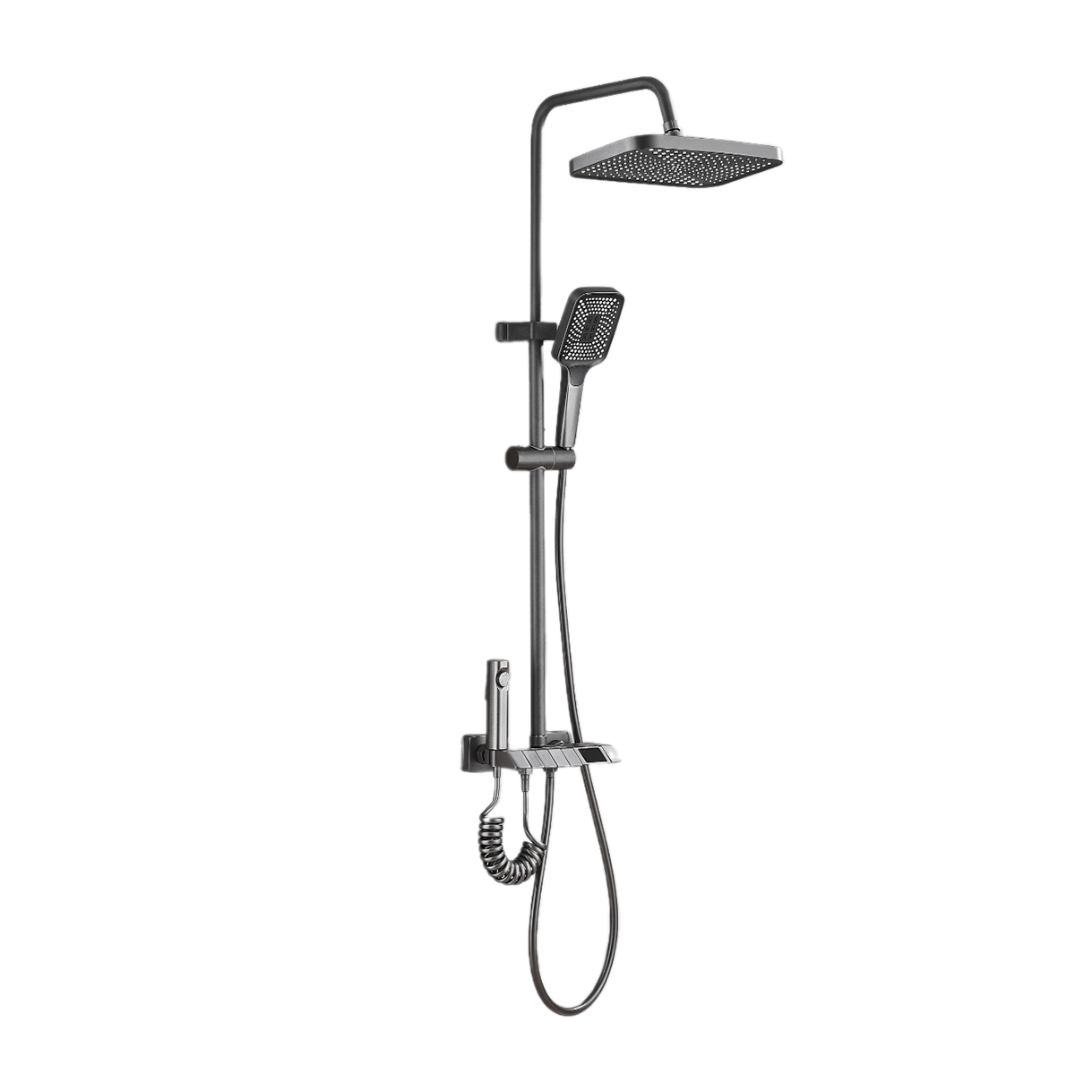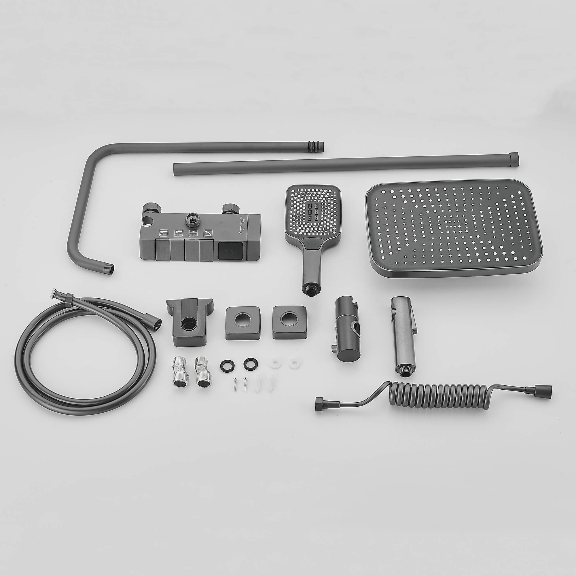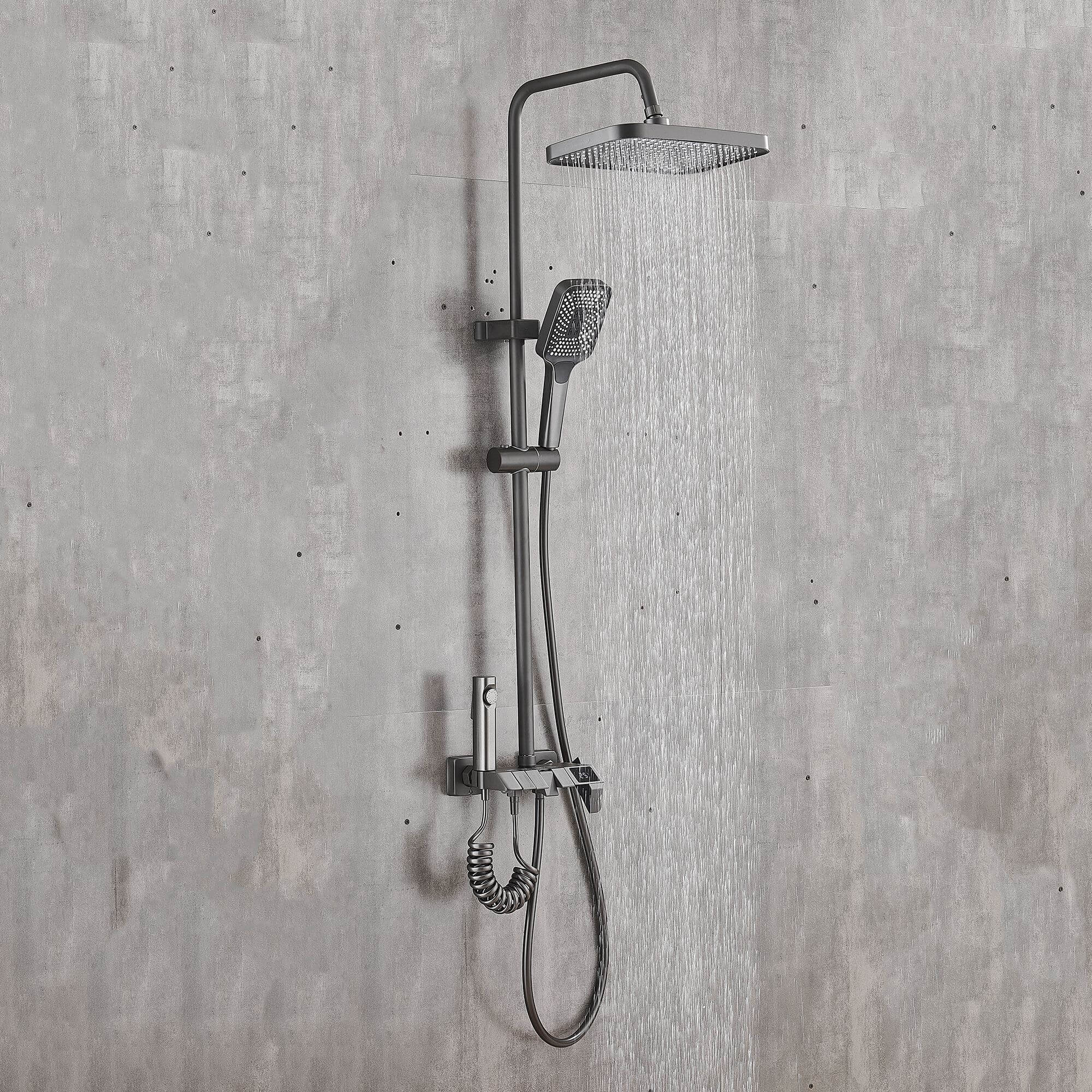 - Материалсмеситель для корпуса из латуни, насадка из ABS, душевая штанга из нержавеющей стали, шланг из ПВХ, распылитель из пластика